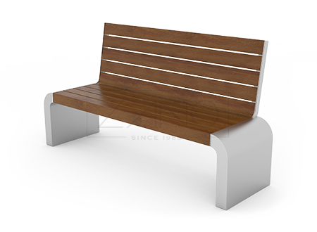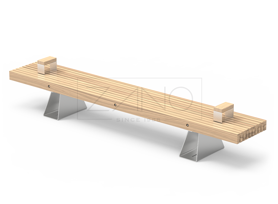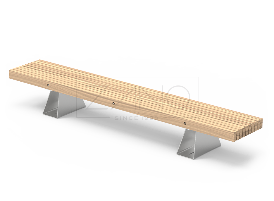 Composée des lattes de bois posées verticalement, l'assise est plus résistante à la pression. De plus, les lattes sont liées l'une à l'autre par une barre en inox qui a pour but de garder la même distance entre les lattes et de rigidifier la construction. Le dossier composé de trois lattes de bois plus courtes garantit un repos confortable de la colonne vertébrale. Le modèle 02.016.1 est aussi muni des accoudoirs. Malgré le poids important de ce banc de ville, il paraît très léger.