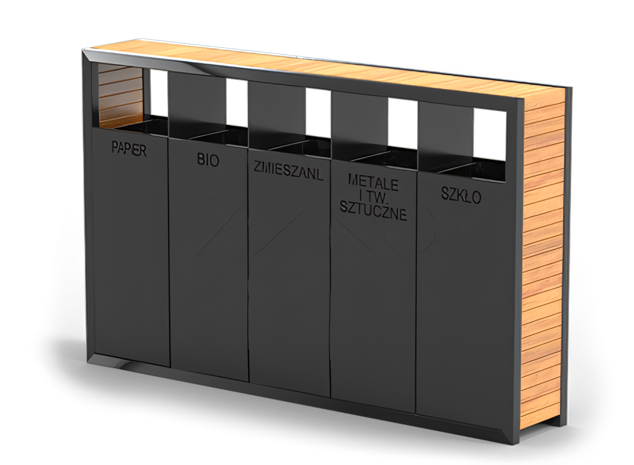 La poubelle de recyclage Pavo est une version à 5 compartiments de la populaire poubelle de ville. En élargissant la poubelle à 5 compartiments, nous répondons aux dernières exigences de la politique de tri des déchets. Chaque chambre est conçue successivement pour : le papier et le carton, les métaux et les plastiques, le verre, les biodéchets et les déchets mixtes. La version de base de la poubelle est fabriquée en acier inoxydable et en bois exotique. Il est possible de commander le panier en acier au carbone, galvanisé et revêtu par poudre, et en bois d'épicéa ou de pin (les bois domestiques sont vernis). Le bois peut être remplacé par un stratifié HPL.
