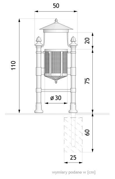 La poubelle d’extérieur Royal appartient à notre gamme « rétro ». Elle se démarque par une structure originale reposant sur deux tubes en acier avec des éléments ornementaux en fonte moulée et par un chapeau protège-pluie très élégant. Son bac est fabriqué en tôle perforée et doté d’un élément décoratif conique attaché au fond, en même forme que le chapeau protège-pluie, ce qui crée un aspect symétrique, très agréable à l’œil. Avec son design remarquable et sa finition minutieuse, la corbeille publique Royal saura embellir les espaces historiques protégés et les sites touristiques de votre ville. Nous vous encourageons à consulter également le modèle 03.034 s’inscrivant dans le même style mais équipé d’un seul poteau.