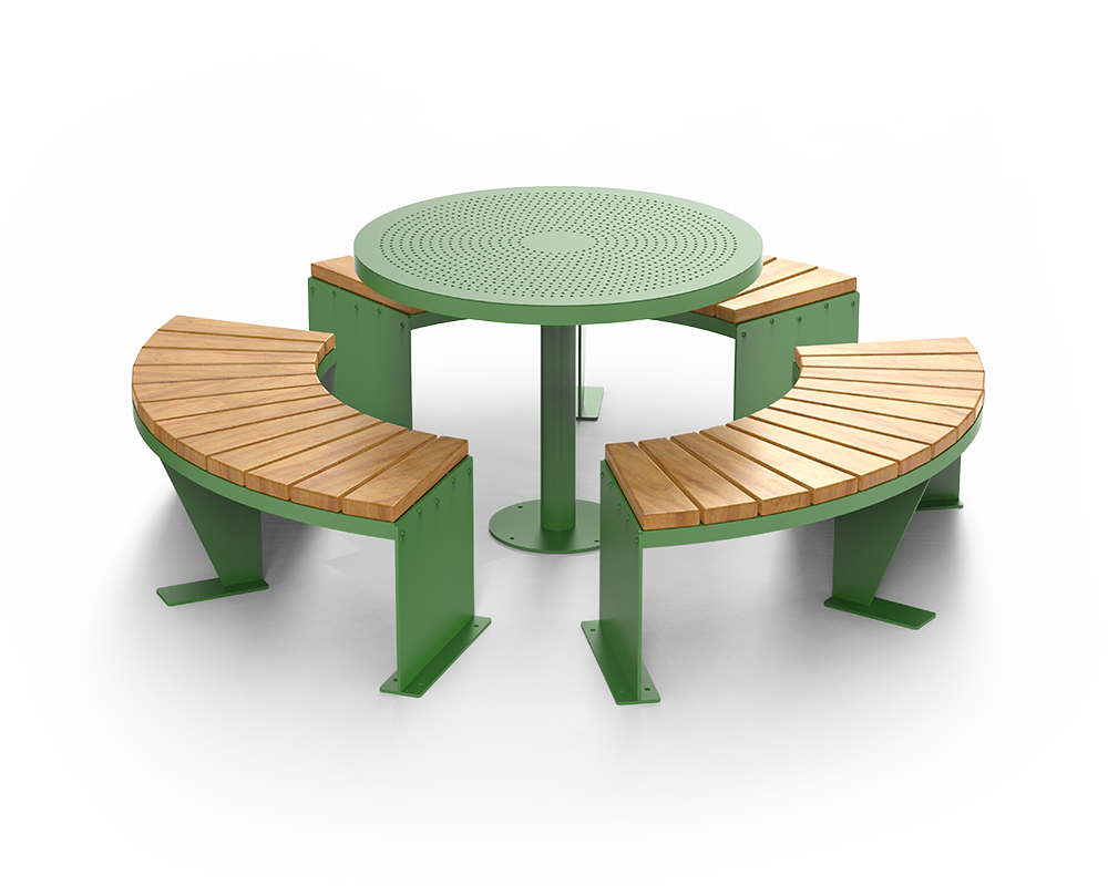 Table de pique-nique Scandik avec bancs Domino. Acier carbonisé, galvanisé et peint en vert.